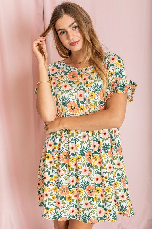 Presenting the Ditsy Floral Ruffle Chest Pocket Dress, a fun addition to your closet that blends easy comfort with lively elegance. This dress, which was made in the US, is ideal for people who value a sweet, carefree look without compromising on style.