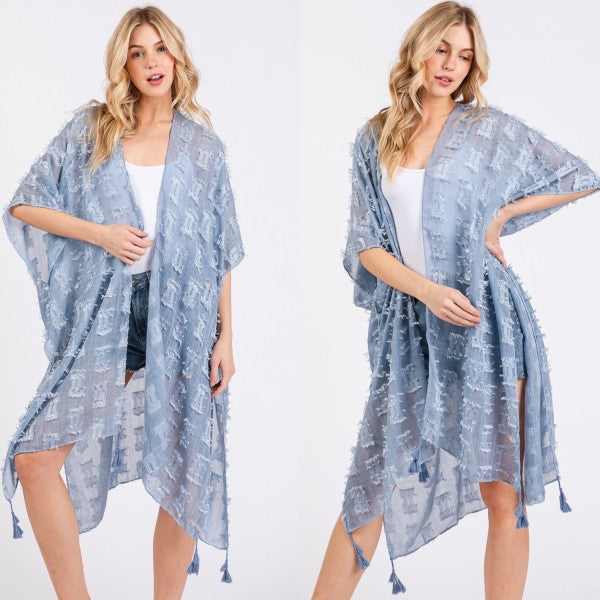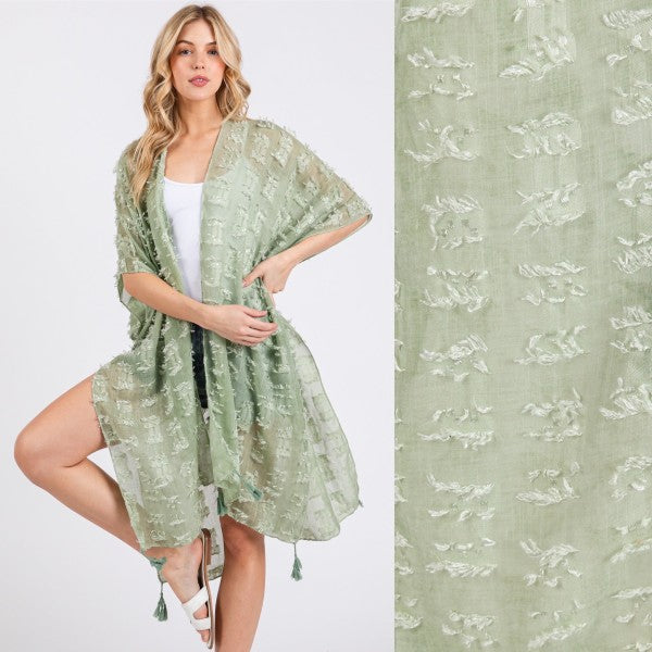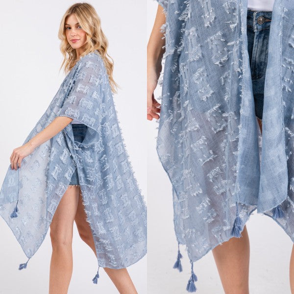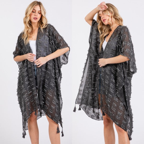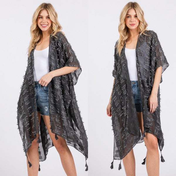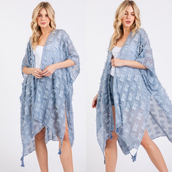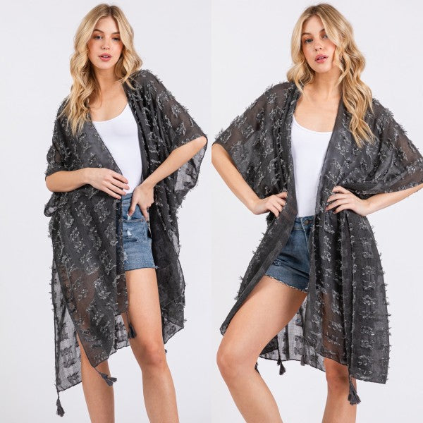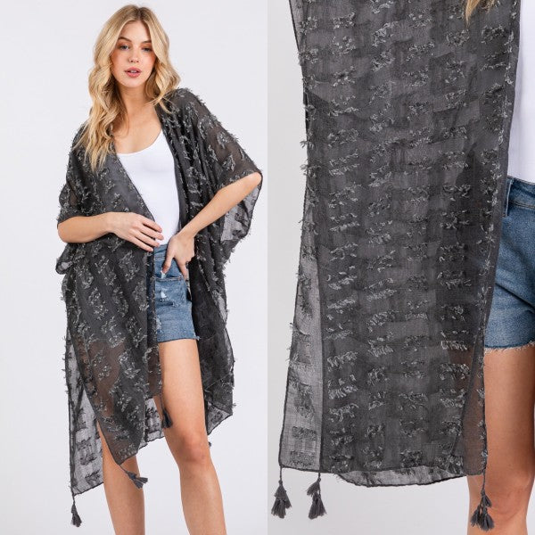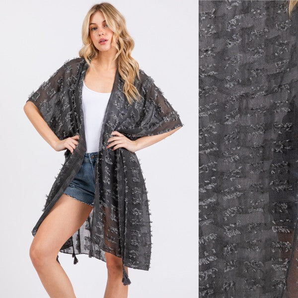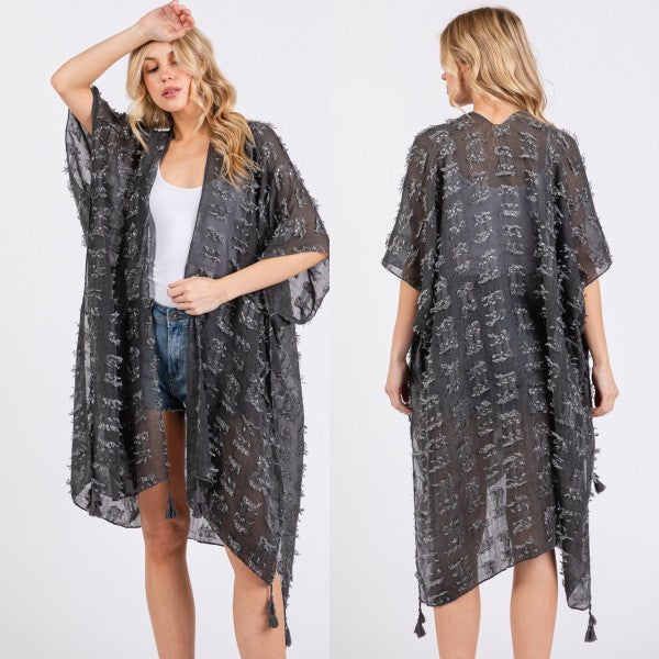 Distressed Pattern with Tassel Open Kimono Shawl