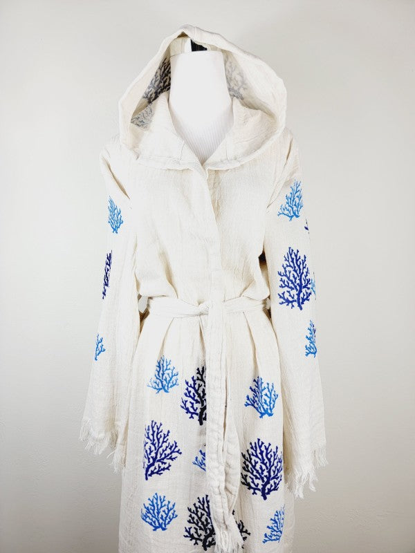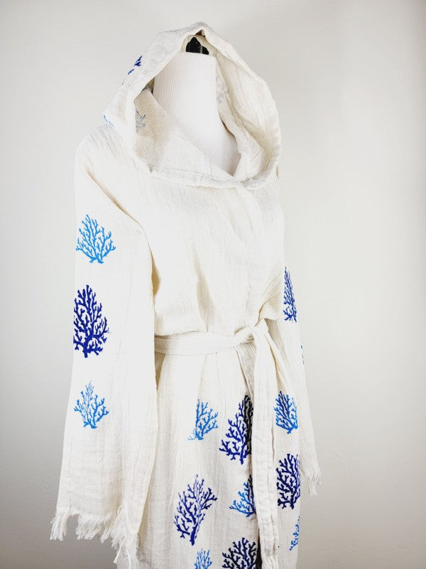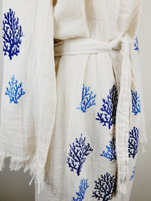 This unisex robe combines luxurious softness with practical design, crafted from two layers of breathable, 100% organic Turkish cotton muslin. Handmade using natural dyes and woodblock printing, it offers a hypoallergenic and highly absorbent fit. Its elegant shawl collar and waist belt complement the oversize silhouette, accommodating all sizes with ease. Versatile enough for lounging at home, beach outings, or spa days, this timeless piece enhances comfort and style effortlessly. Easy to care for, it softens with each wash and maintains its refined quality for years to come.