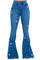 High Rise Bell Bottom Jean in Medium Blue features front button and zipper closure, frayed hem, front and back pockets, front hand pressed pink heart stud details, Made in USA