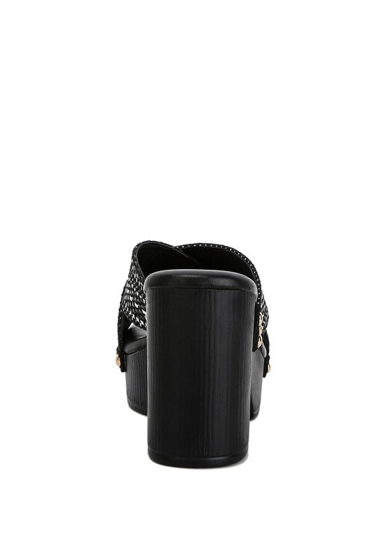 Perfect for your next island getaway! The high-heeled mules are sublime with a touch of bohemian with the patterned crises cross raffia vamp. The high heels add a bit of flair to the design while the stud embellishments elevate the overall aesthetic.