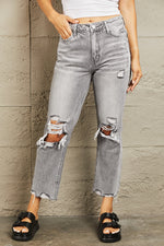 These jeans are crafted from premium quality denim, ensuring a soft and stretchy fit that flatters your curves while providing all-day comfort. The high waist design offers a flattering silhouette, while the trendy distressed details add a touch of edginess to your outfit. The cropped length gives a modern and chic look, making these jeans a versatile addition to your wardrobe, perfect for casual outings or dressing up for a night out. Elevate your fashion game with these must-have jeans that effortlessly combine fashion and functionality.