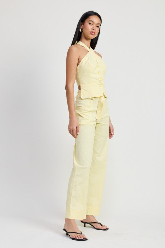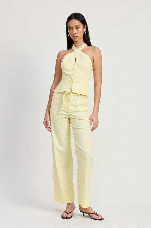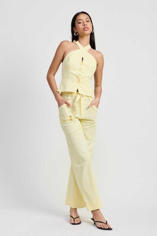 These sophisticated linen long pants are the ideal combination of comfort and stylish design as you enter the sunny season. These pants are a flexible wardrobe essential because of their timeless cut, which accentuates any body. Perfect for spring and summer days, the delicate yellow color creates a feeling of freshness and airiness.