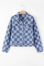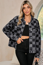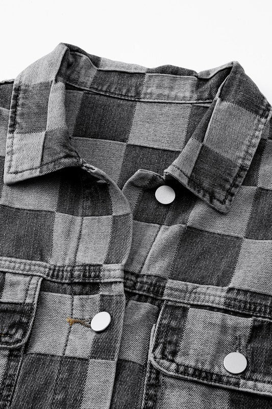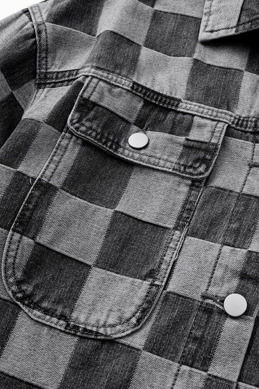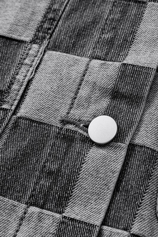 The checkered patchwork design adds a trendy flair to the classic button-up style, creating a unique and eye-catching look.