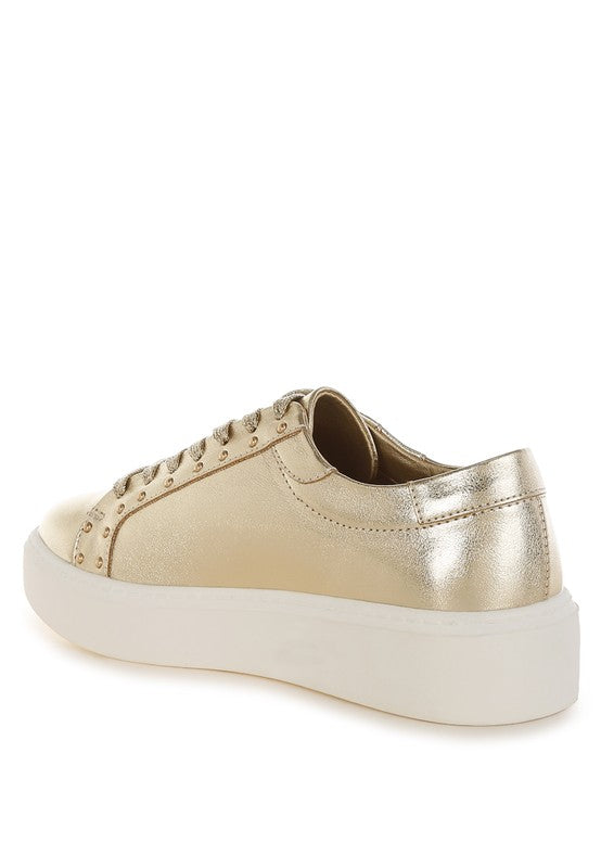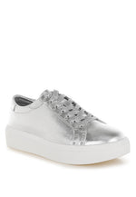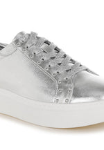 Cincinati Metallic Pleather Chunky Sneakers Closed Round Toe Flatform Heel Stud Accessories Upper Material: Metallic Pleather Outer Sole: TP Rubber