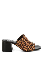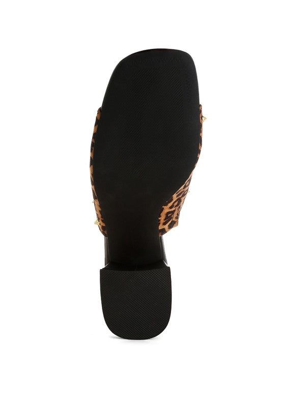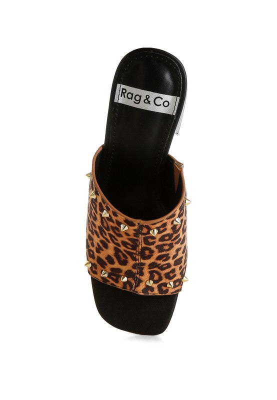 Open square toe, angled block heel, rubber outer sole, leopard print detail, and metallic stud embellishments