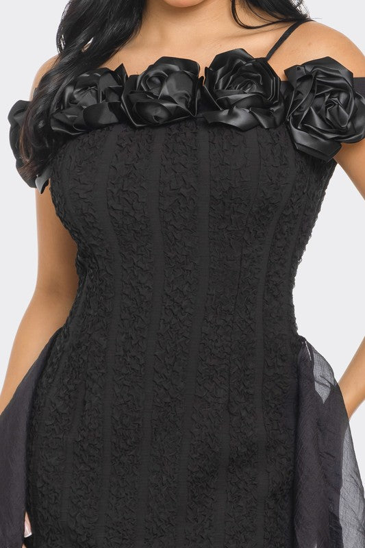 Introducing our Enchanting Rose Off-Shoulder Dress - a sartorial symbol of elegance with a flirtatious touch. Available in passionate red and classic black, this dress features an exquisite off-shoulder neckline adorned with a row of delicate handcrafted roses, bringing a romantic allure to any occasion. The textured fabric, with its intricate patterned lace, hugs the contours of your figure, celebrating your form with its sleek midi length. Flowing tulle streamers cascade from the waistline, adding a whimsical and ethereal charm as you move.