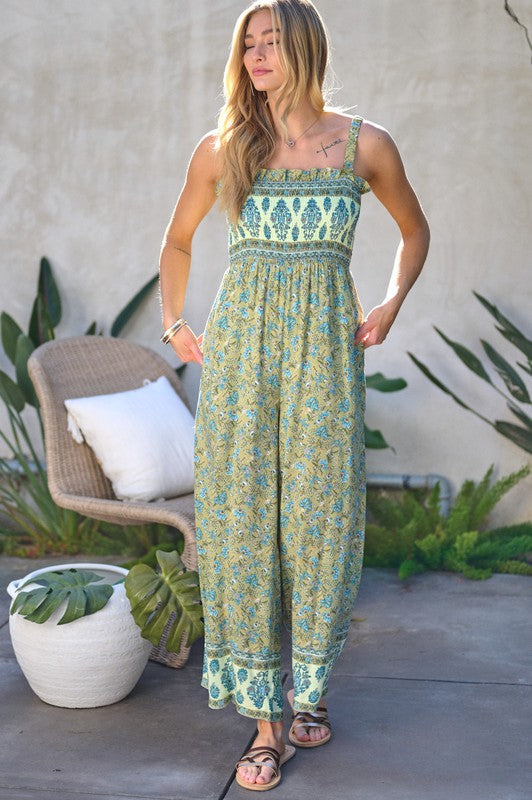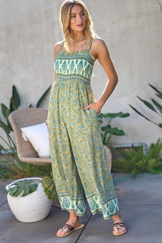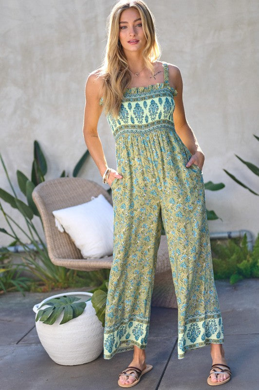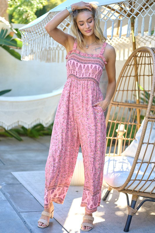 Embrace the essence of spring and summer with our Floral Smocked Detail with Ruffle Jumpsuit. This piece is a celebration of all things bright and beautiful, perfectly blending comfort with a dash of elegance.