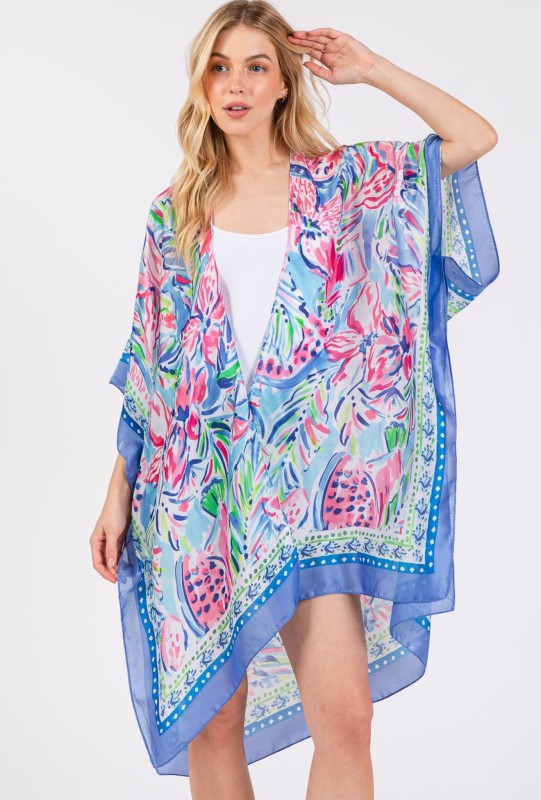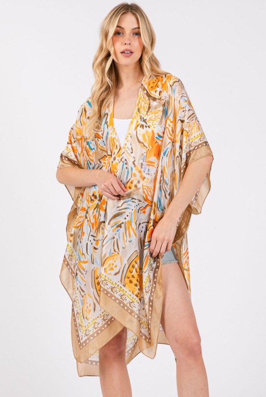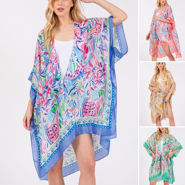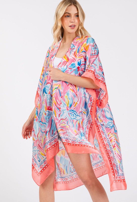 Flower Print Silky Feel Open Kimono Shawl