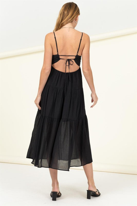 The Full Heart Smocked Cutout Midi Dress is a romantic and enchanting choice for any special occasion. This dress is designed to capture hearts with its elegant details and flattering silhouette. The V-neckline and adjustable spaghetti straps create a graceful and feminine look, while the fitted bodice accentuates your figure beautifully. The A-line midi skirt is high-waisted and features a dreamy three-tiered ruffled hem, adding movement and charm to your every step. The back of the dress is a showstopper, with a backless design that ties together with a delicate back-tie detail and a captivating cutout accent.