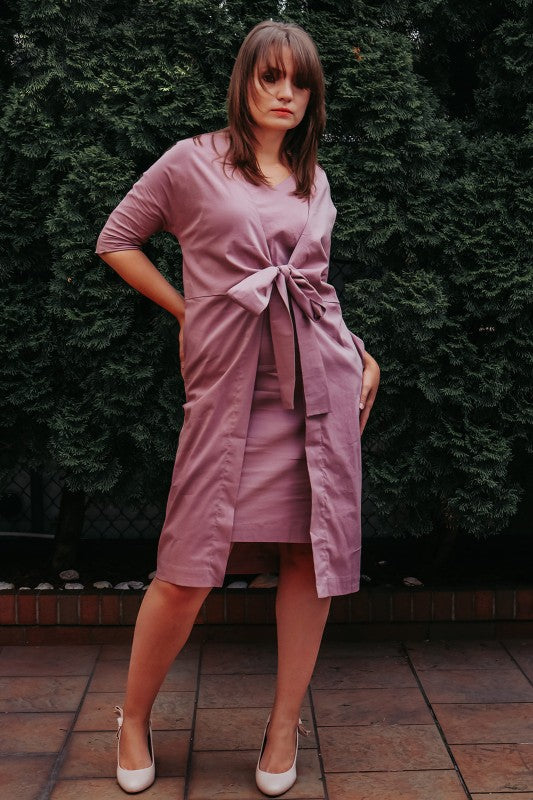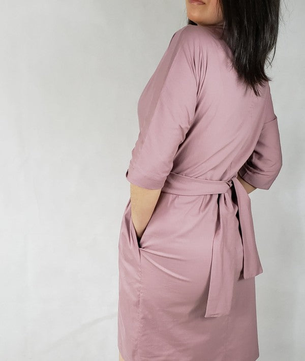 kimono-inspired design, this dress is made from cotton with a light and crisp quality. V neck with 2 layer fronted.Belted at the waist for added shape can be tie 3 different ways, it has wide kimono sleeves, discreet side pockets and it is completed fine, clean-cut edges.