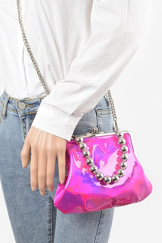 Check out the new metalic mirrored top handle swing clutch bag for women. Catch compliments with this ultra-trendy women's handbag. With a glossy finish and bold structure, fashion purse is a bold fusion of glam and color with modern edge. The beaded handle adds a luxury twist with the detachable chain strap to provide you a hands-free options for day or night wear.