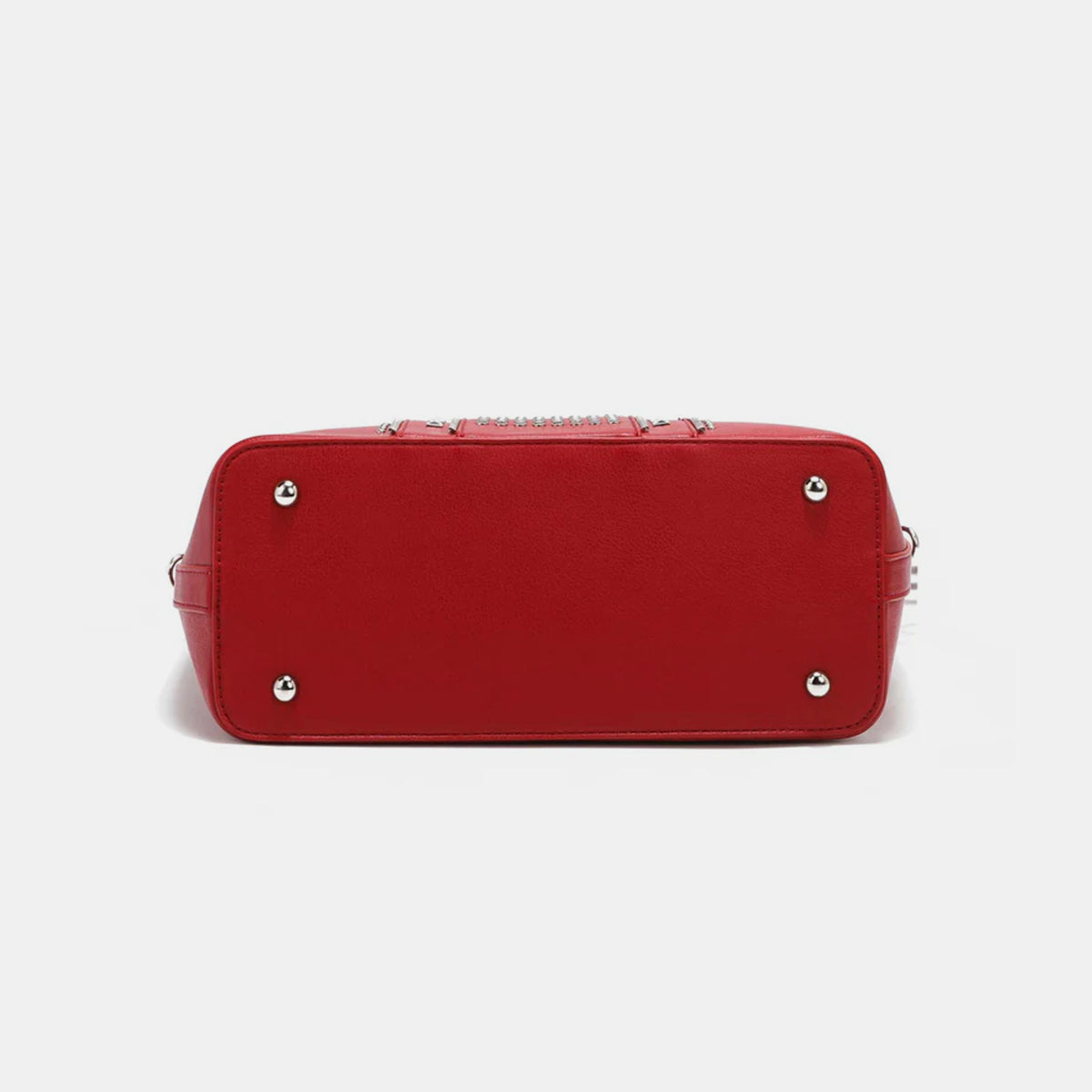 This Studded Decor Tote Bag is a chic and versatile accessory that adds a touch of edge to your ensemble. The studded decor detailing gives the tote bag a trendy appeal. With its spacious interior and durable design, this tote bag is perfect for carrying your essentials in style. The sturdy handles make it comfortable to carry, while the edgy embellishments add a touch of personality. Pair this tote bag with a variety of outfits for a stylish and on-trend look. Elevate your accessories collection with this statement-making studded decor tote bag that combines fashion and function seamlessly.