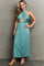 This dress is a perfect blend of elegance and modernity, designed to make you feel confident and stylish on any occasion. This dress showcases a unique halter neck silhouette that beautifully accentuates your shoulders and back. his dress showcases a unique halter neck silhouette that beautifully accentuates your shoulders and back. The criss-cross pattern adds an alluring touch, creating a visually striking effect that will turn heads wherever you go. The highlight of this dress is the daring cut-out in the front, strategically placed to add a hint of sensuality without compromising on sophistication. It adds an element of intrigue and elevates the dress to a new level of glamour. The cut-out is tastefully designed to enhance your natural curves, creating a flattering and feminine silhouette. This dress ensures maximum comfort throughout the day or night. The fabric drapes beautifully, emphasizing the fluidity of the design and enhancing your movements. Whether you're attending a cocktail party, a formal event, or a romantic dinner, this dress will make you feel effortlessly chic and glamorous.