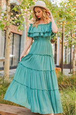 Shop this elegant and swingy maxi dress made in an off the shoulder look with tiered ruffle accents.