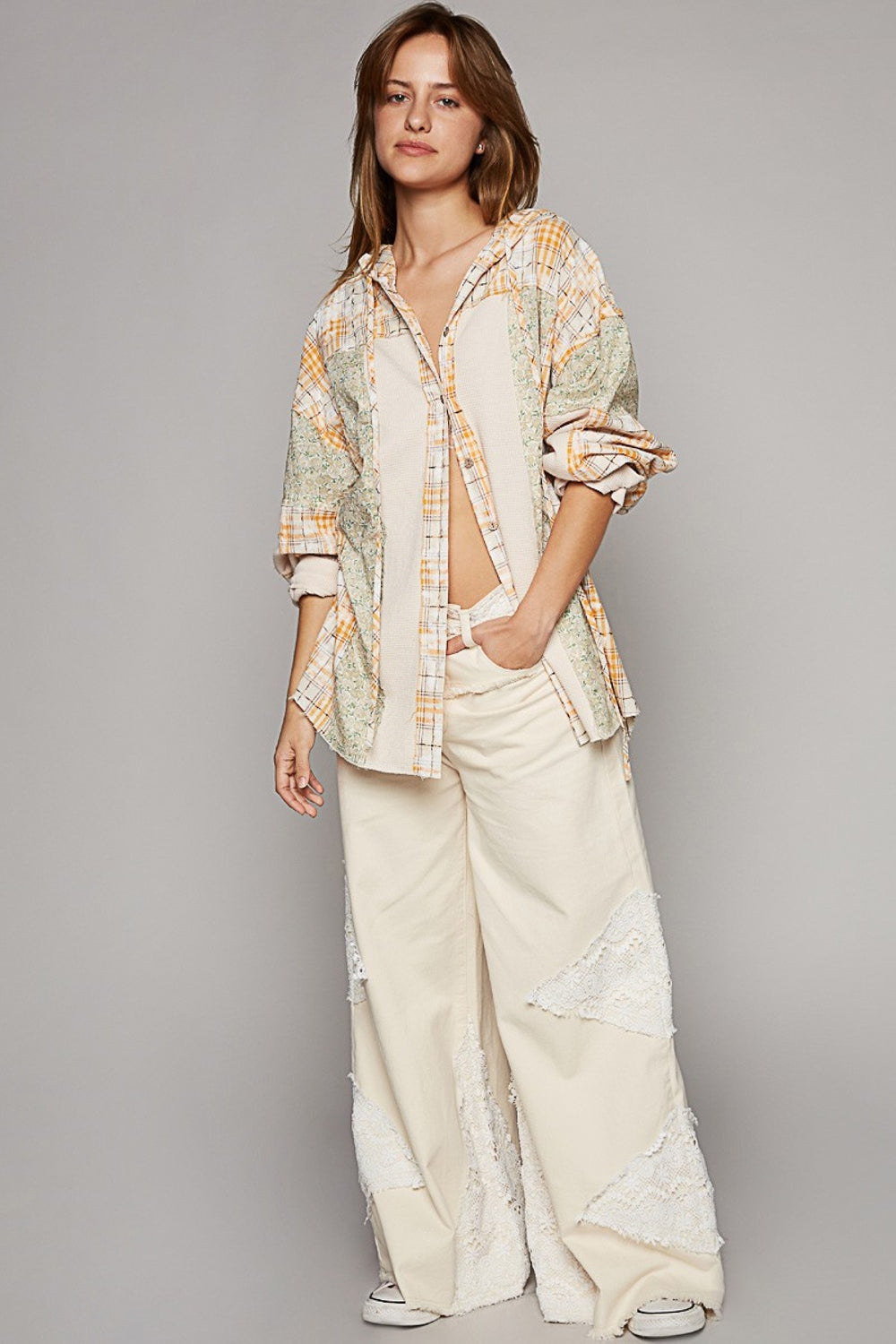 POL Long Sleeve Knit Mixed Hoodie Plaid ShirtPOL Long Sleeve Knit Mixed Hoodie Plaid Shirt