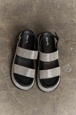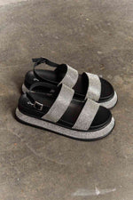 Elevate your footwear game with this dazzling flatform style, designed to add a touch of glamour to any outfit. The two bands of shimmering rhinestones create a captivating sparkle that will catch everyone's eye as you walk. With a secure and comfortable fit, thanks to the slingback strap, you can confidently step out in style all day long. Embrace the elegance and radiance of these sandals, perfect for any occasion where you want to shine and stand out from the crowd.