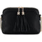 Solid tone faux leather body, two tassel front, and gold tone hardware