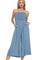 This elegant strapless culotte jumpsuit features a sophisticated bandeau top with delicate ruching across the bodice, creating a flattering silhouette. Crafted from soft, lightweight jersey fabric in a beautiful heathered blue shade, it offers both comfort and style. The wide-leg culotte design provides ease of movement while maintaining a polished look. Practical side pockets add functionality, and the elastic waistband ensures a comfortable fit. Perfect for casual outings, beach vacations, or dressed up for evening events. The breathable material makes it ideal for warm weather wear.