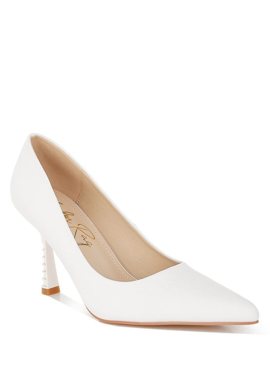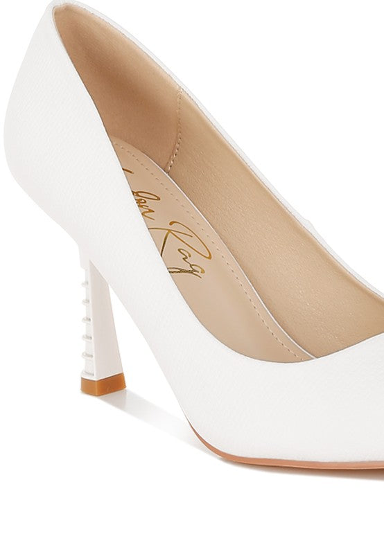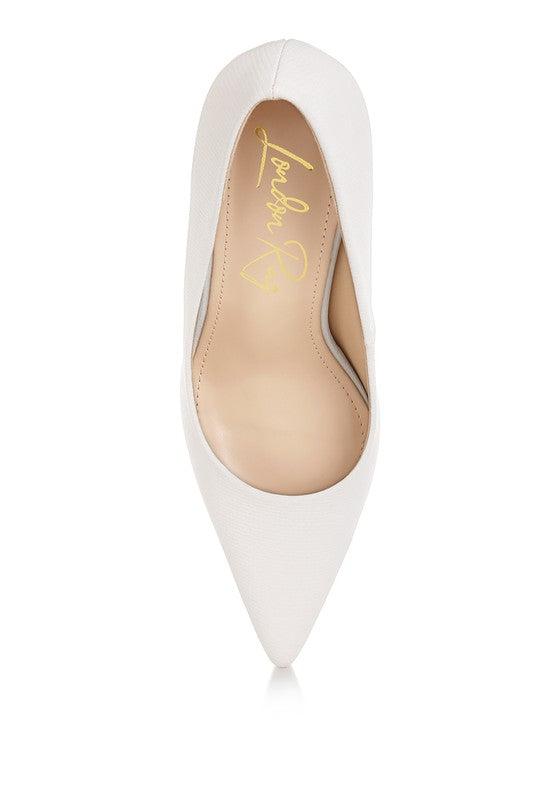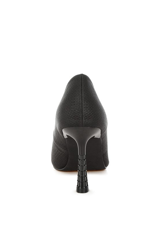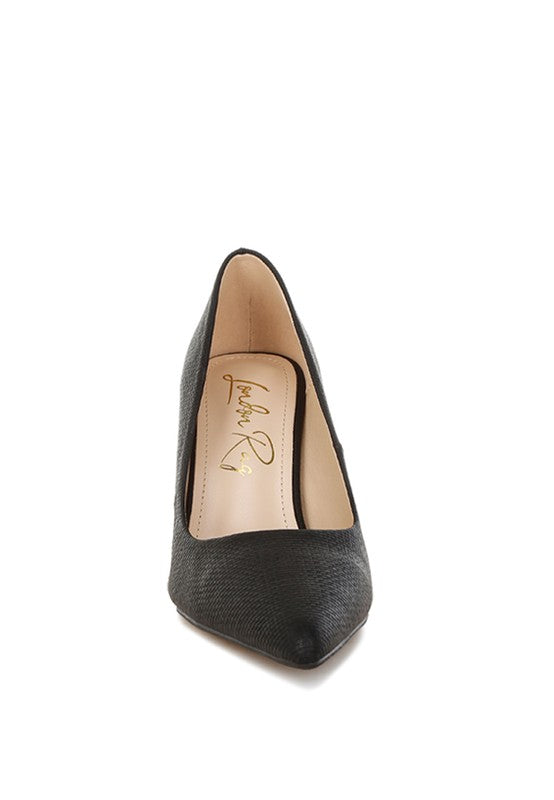 Closed Pointed Toe, Textured Detail, Stiletto Heel, Upper Material: Faux Leather, Outer Sole: TP Rubber, Comfortable Cushion Insoles, Heel: 3.5 inches tall